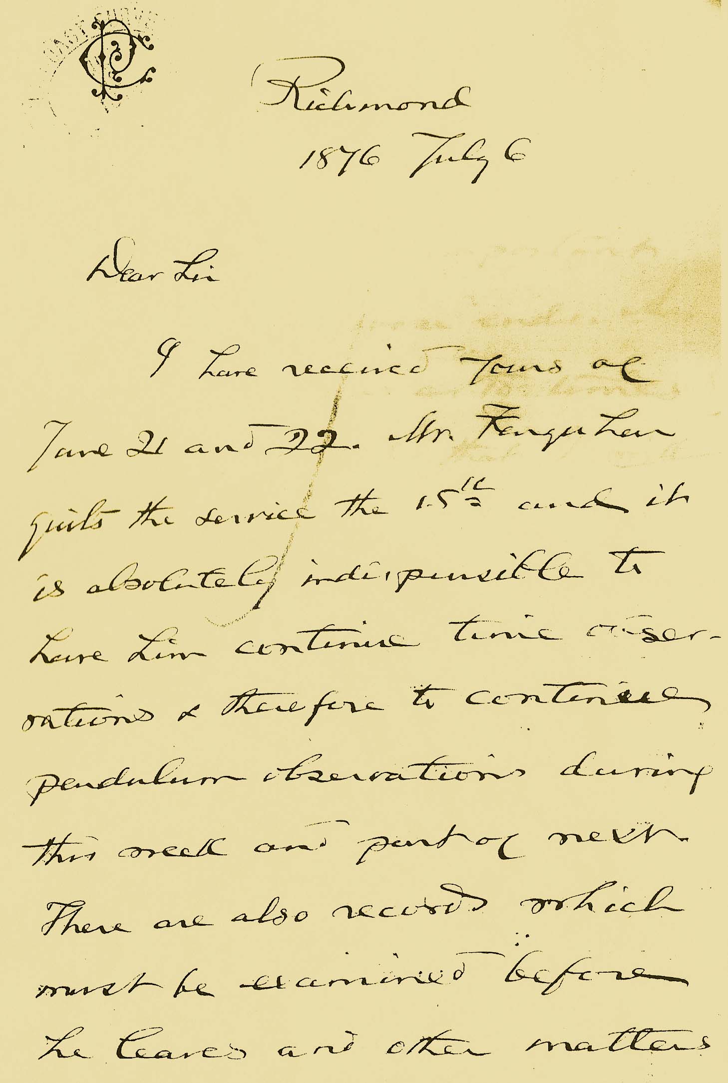 6 de julio 1876 Estimado señor, He recibido sus cartas del 21 y 22 de junio1. Mr. Farquhar deja el servicio el día 152 y es absolutamente indispensable que continúe las observaciones del tiempo, y por tanto que continúe las observaciones pendulares durante esta semana y parte de la siguiente3. Hay también registros que deben ser examinados antes de que se vaya y otras cuestiones |