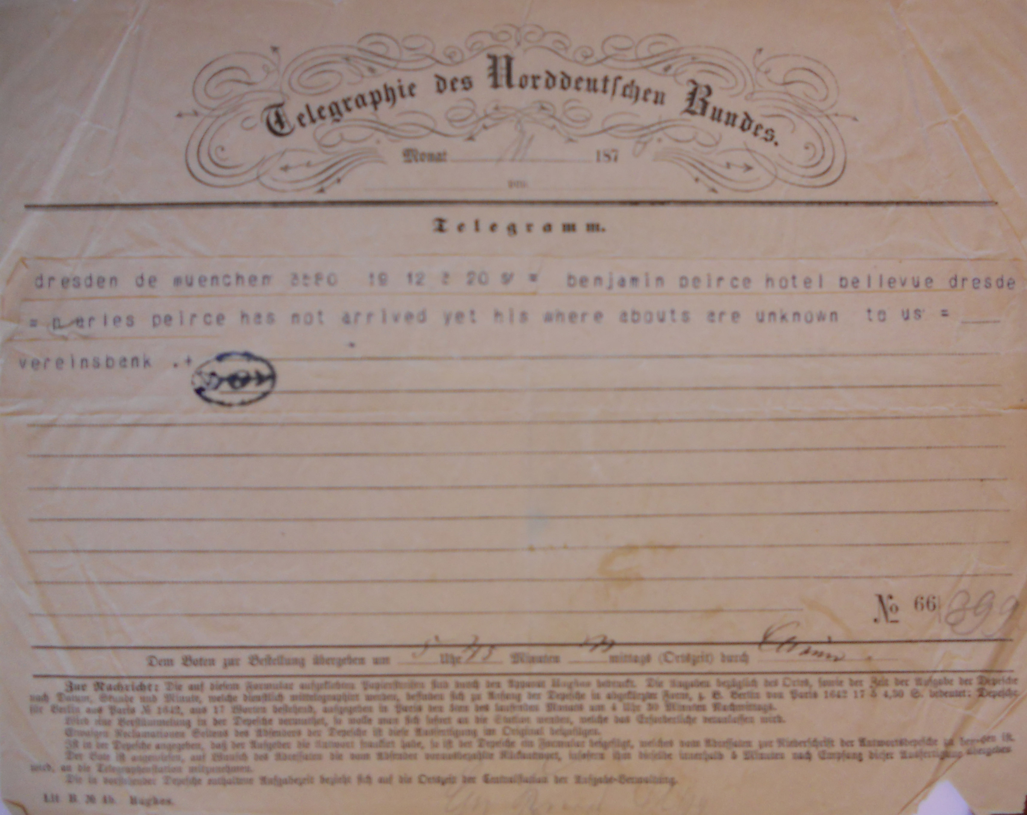 De este telegrama, enviado por el Vereinsbank de Munich a Benjamin Peirce, ya en Dresde, se infiere que Charles no ha llegado todavía a allí, ni saben dónde está. De hecho se encontraba en España.
