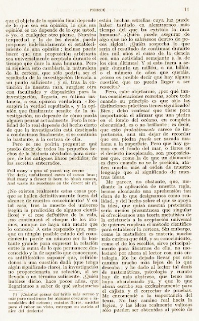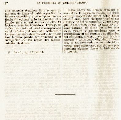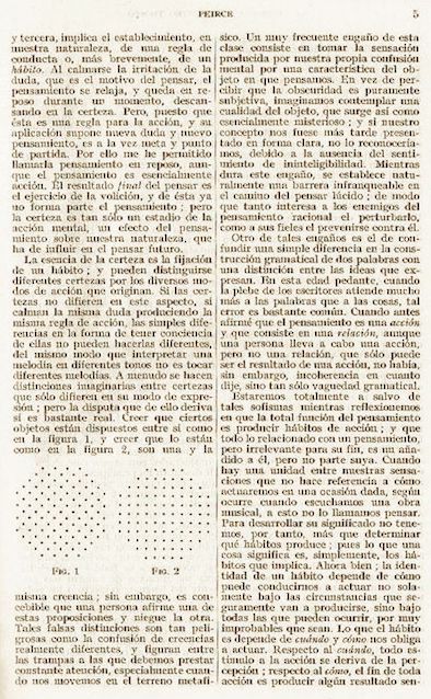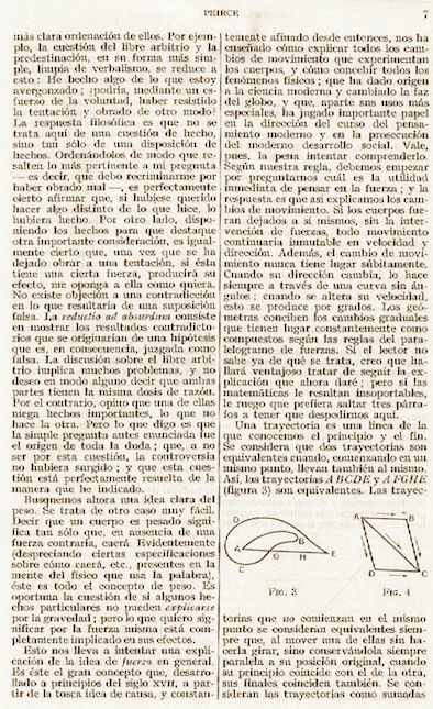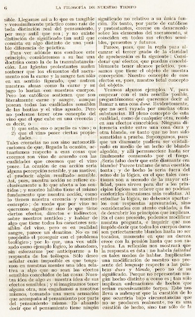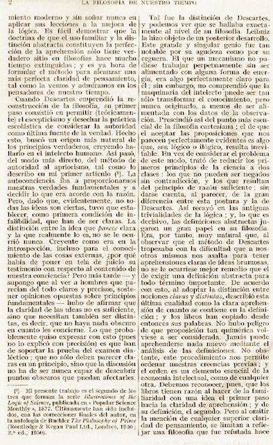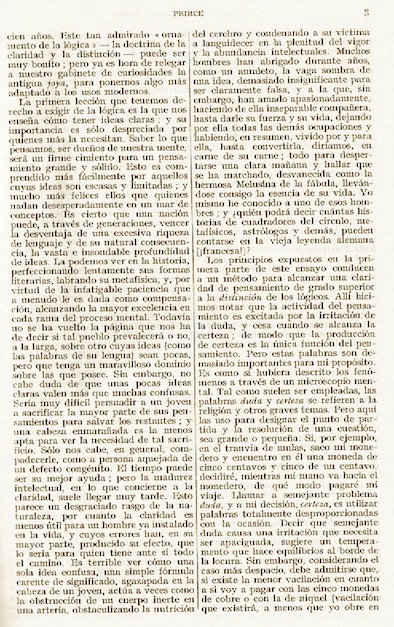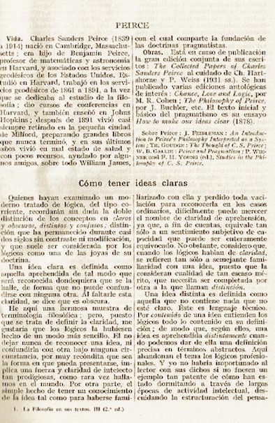 “Cómo tener ideas claras” (mejor traducido por “Cómo esclarecer nuestras ideas”) parece constituir el primer texto completo de Peirce publicado en español. El tercer tomo de la amplia antología de textos filosóficos editada por Marías se denomina explícitamente “De Charles Sanders Peirce a Francisco Romero”. Situado antes del artículo de Peirce, un breve comentario de Marías sintetiza en 20 líneas (“Vida”, “Obras”, “Sobre Peirce”) la entrada que este había realizado anteriormente en su Historia de la filosofía (Madrid: Manuales de Revista de Occidente, 11ª edición, 1958, 387-392). La traducción (cuyo autor no se registra) es correcta e incorpora la totalidad del artículo de Peirce (incluidas las figuras.)