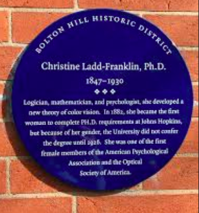 ![]() Placa de la residencia de Christine Ladd-Franklin, 1507, Park Ave., Baltimore. [Fuente: Loyola Notre Dame Library] Para más información sobre la instalación de esta placa puede leerse Jean Lee Cole, "Christine Ladd-Franklin, a Scientist from Bolton Hill", The Bolton Hill Bulletin 47/3 (2018). |