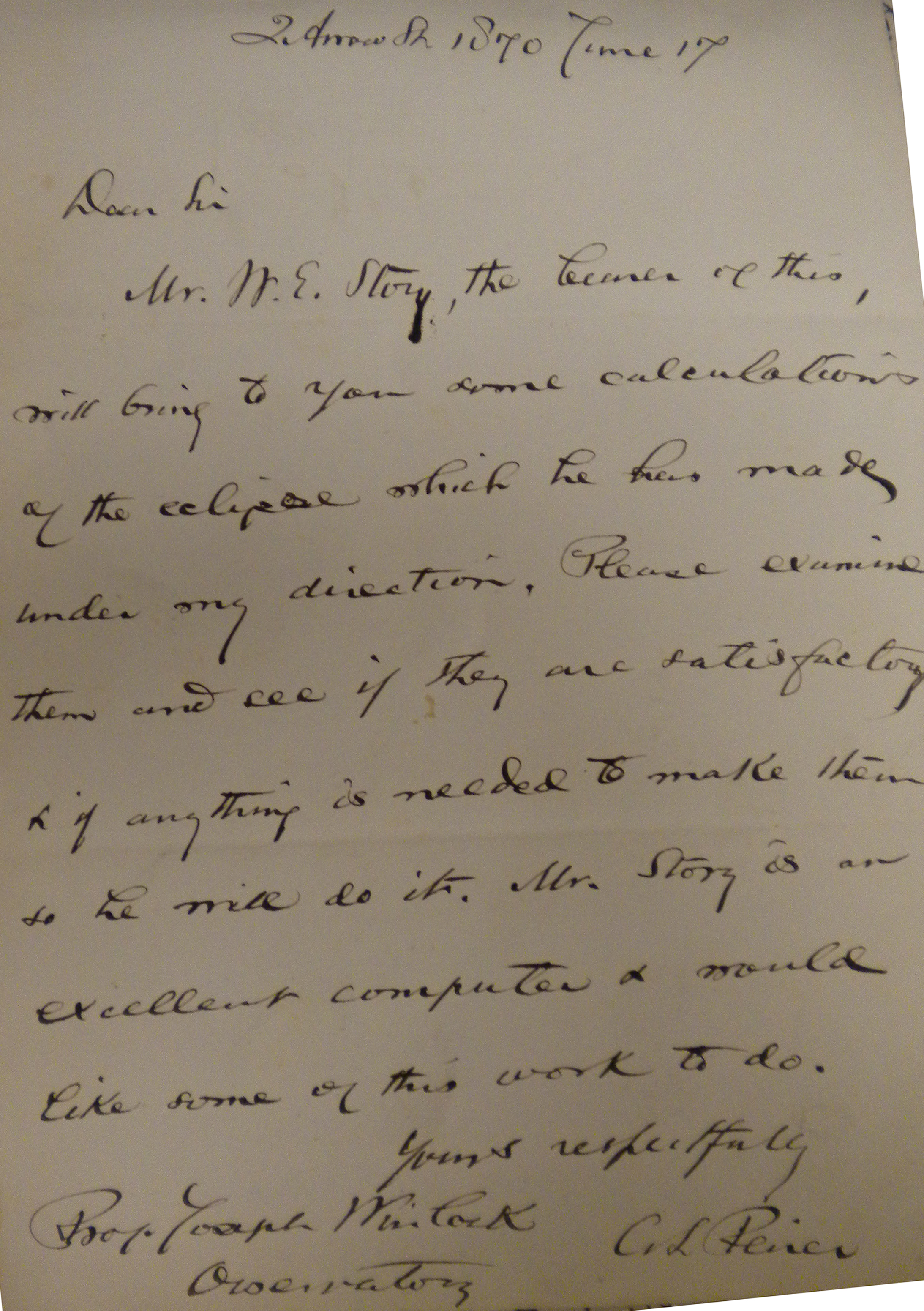 Dear Sir Mr. W. E. Story, the bearer of this, will bring to you some calculations of the eclipse which he had made under my direction. Please examine them and see if they are satisfactory & if anything is needed to make them so he will do it. Mr. Story is an excellent computer & would like some of this work to do. C. S. Peirce Observatory |