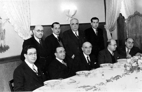 6. Madrid, febrero, 1944. Homenaje a Karl Vossler. De izquierda a derecha, sentados: Angel Valbuena Prat, Emilio García Gómez, Karl Vossler, Dámaso Alonso y José María de Cossío; de pie: Juan Guerrero Ruiz, pendiente de identificación, Eugenio d'Ors y Manuel Muñoz Cortés. |