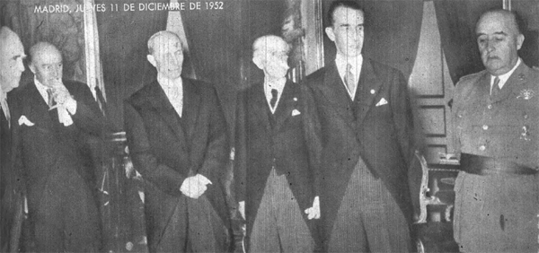 11. 10-XII-1952. Recepción del Patronato del Museo del Prado. De izquierda a derecha: Eugenio d'Ors, Marqués de Moret, Fernando Labrada, Conde de Casal, Antonio Gallego Burín y Francisco Franco |