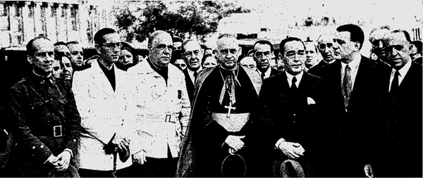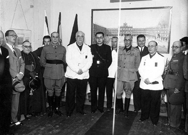 De izquierda a derecha: pendiente de identificación (cortado); Ramón Laporta Girón, Jefe provincial de Falange (?); Enrique Pla y Deniel. Obispo de Salamanca; pendiente de identificación (segundo plano), Eduardo Martín González, Gobernador militar de Salamanca; Eugenio d’Ors, Director General de Bellas Artes; Manuel Torres López, Alcalde de Salamanca (?); pendiente de identificación; Santiago Martínez Guardiola, Ayudante del Gobernador militar (?); pendiente de identificación; pendiente de identificación; pendiente de identificación; pendiente de identificación (segundo plano). |