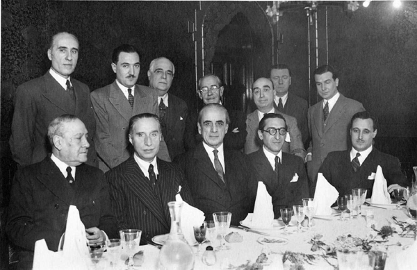 5. 7-XII-1942. Almuerzo ofrecido al embajador de Argentina en España, Alberto Palacios Costa. De izquierda a derecha, sentados: Manuel Machado Ruiz, José María de Yanguas y Messía, Alberto Palacios Costa, Rafael Sánchez Mazas y Manuel Halcón Villalón-Daoiz; de pie: Pedro Mourlane Michelena, José María Alfaro Polanco, Eugenio d'Ors, Eduardo Marquina, Carlos Blanco Soler, Manuel Aznar Zubigaray y Tomás Gistau Mazzantini |