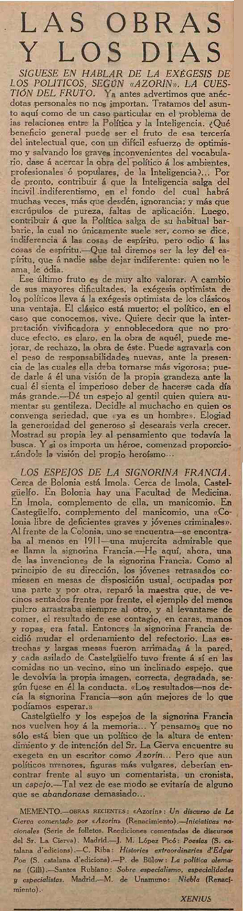 | Síguese en hablar de la exégesis de los políticos, según «Azorín». La cuestión del fruto / Los espejos de la signorina Francia / Memento | ||